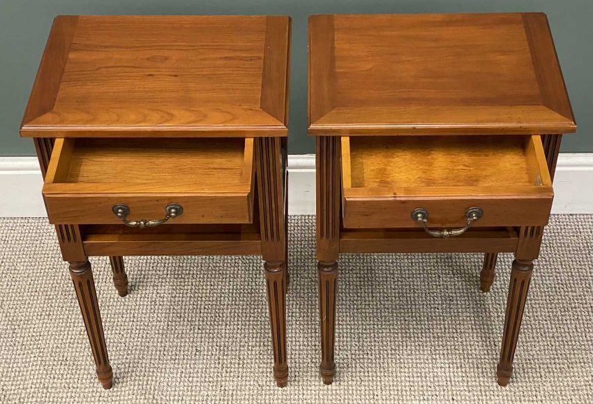 PAIR OF PRESTIGE BEDSIDE TABLES of modern golden mahogany in classic style with single drawers, 70 (h) x 41 (w) x 30cms (d)Provenance: private collection Ynys Môn