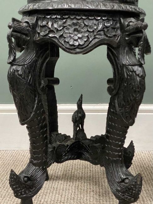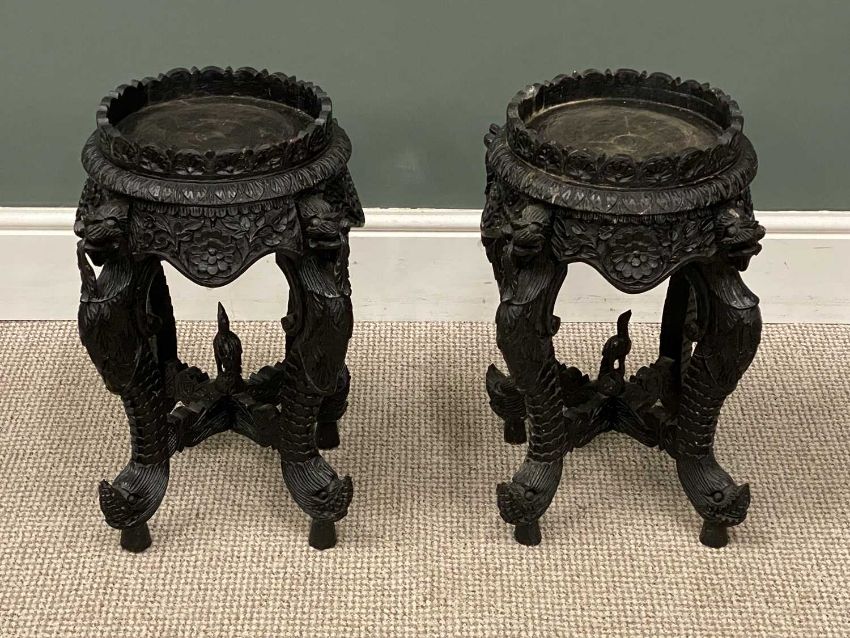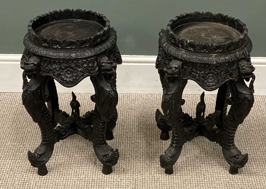 PAIR OF INDIAN CARVED HARDWOOD JARDINIERE STANDS, 51 x 23cms (diam.)Provenance: private collection Conwy