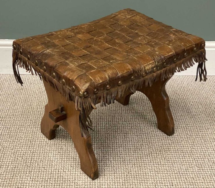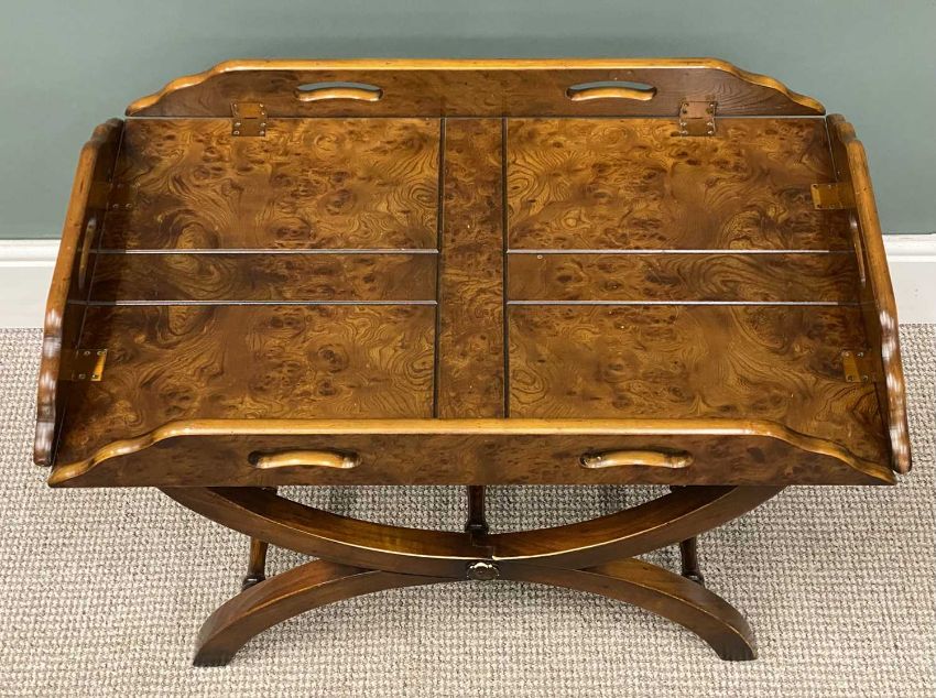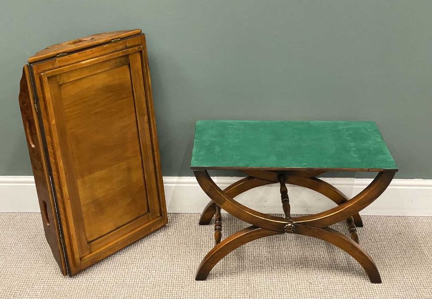 BURR WALNUT EFFECT BUTLER'S TRAY ON STAND, 58 (h) x 84 (w) x 51cms (d), vintage wooden tray and upholstered seated stoolProvenance: deceased estate Denbighshire