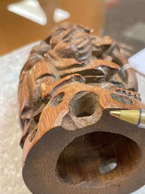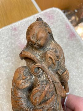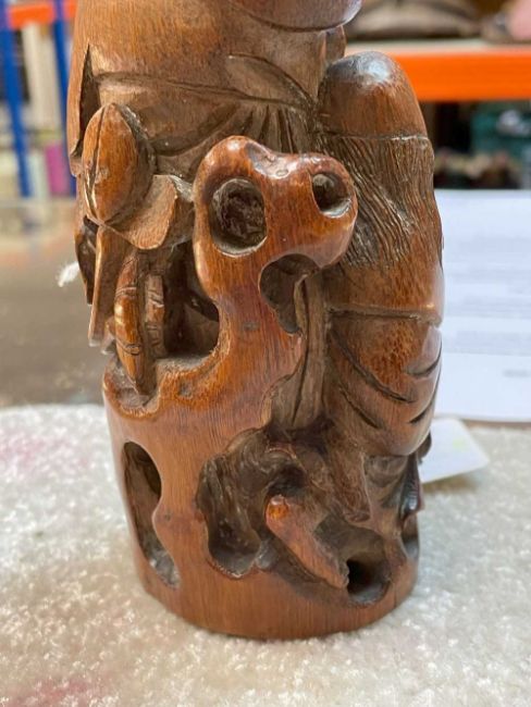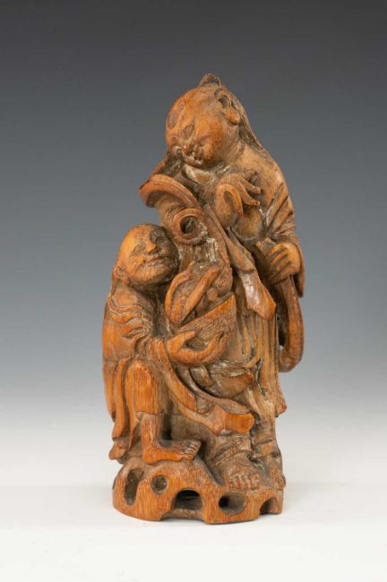 CHINESE CARVED BAMBOO 'LUI HAI' GROUP, Qing Dynasty, of the Daoist with characteristic lucky toad, 15.3cms (h)Provenance: private collection Merthyr TydfilAuctioneers Notes: Liu Hai is the 10th Century Daoist Immortal associated with commercial success. He is almost always depicted together with his three-legged toad and cash, and conveys a wish for prosperity. Whilst there are many versions of the story of Liu Hai and his toad, the essential elements remain that as a reward for his friendship, the toad revealed the secret to eternal life. Holding the toad allowed Liu Hai to travel anywhere in the world instantaneously.