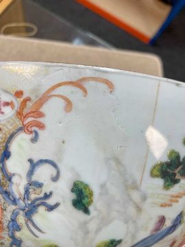 LARGE CHINESE FAMILLE ROSE PUNCH BOWL, Qianlong, painted with Manchu figures in winter clothing in shaped reserved with flowers, 34.5cms (diam.)Provenance: The Cornelia Bayley Collection from the historic Welsh Jacobean house, Plas Teg. Further details on this important Jacobean house - Welsh House Clearance of a Generation — Rogers Jones CoComments: damaged & restored
