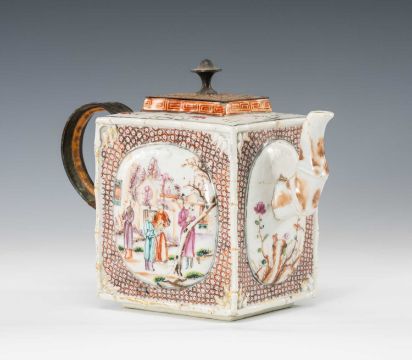 CHINESE FAMILLE ROSE SQUARE TEAPOT, Qianlong, bamboo moulded borders, raised oval panels, short foot, 12cms (h)Provenance: The Cornelia Bayley Collection from the historic Welsh Jacobean house, Plas Teg. Further details on this important Jacobean house - Welsh House Clearance of a Generation — Rogers Jones CoNotes: compare with similar teapot and cover sold Wright Marshall Auctions, lot 1649, 25 Mar 2014.Comments: replaced metal cover & handle, restored spout.