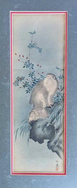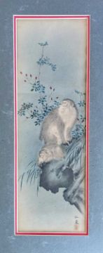 MORI SOSEN (1747-1821) ink & watercolour - Nihonzaru (Japanese macaques) on a rocky outcrop, signed and with red seal, 48 x 15cmProvenance: Bonhams Asian Art sale 29 April 1992; private collection Vale of Glamorgan.Notes: Mori Sosen was a pianter of the Shijo school during the Edo period, and although he did paint other animals and birds, Sosen is most famous for his meticulous paintings of monkeys.Comments: mounted, but unframed, toned, marginal blemishes