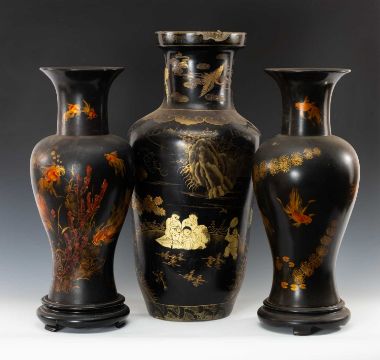 THREE BLACK LACQUER VASES, 20th C, comprising pair Japanese lacquered wood vases decorated with goldfish and water plants, 61cms (h), and Chinese papier-mâché vase decorated with boys and crane in landscape, 68cms (h) (3)Provenance: The Cornelia Bayley Collection from the historic Welsh Jacobean house, Plas Teg, Flintshire. Further details on this important Jacobean house and its clearance Welsh House Clearance of a Generation — Rogers Jones CoComments: foot of one goldfish vase reglued, rim of boys vase damaged.