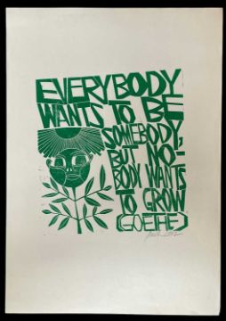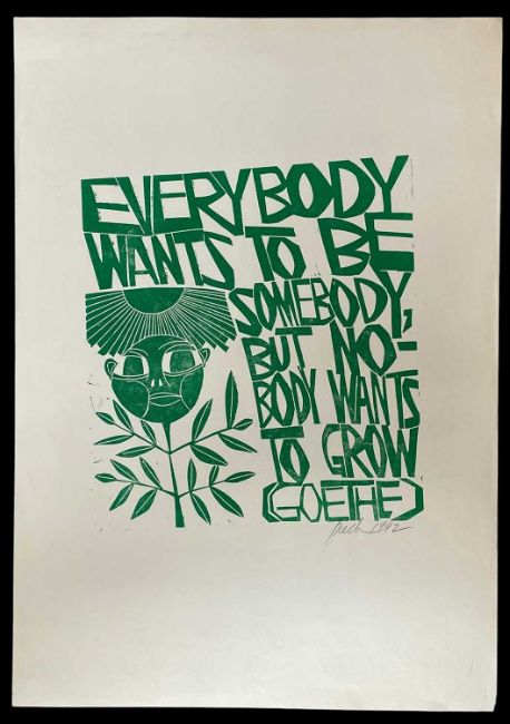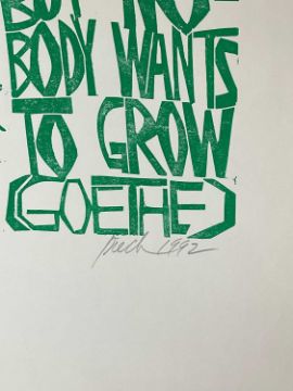 ‡ PAUL PETER PIECH (American, lived / worked Wales 1920-1996) woodcut print - quote from German poet and playwright Goethe, 'Everybody wants to be somebody, but nobody wants to grow', signed and dated 1992, 64 x 45cms together with another smaller woodcut print, quote from Richard II by William Shakespeare, signed and dated 1986, 63 x 21cms (2)Provenance: private collection NetherlandsComments: both unframed