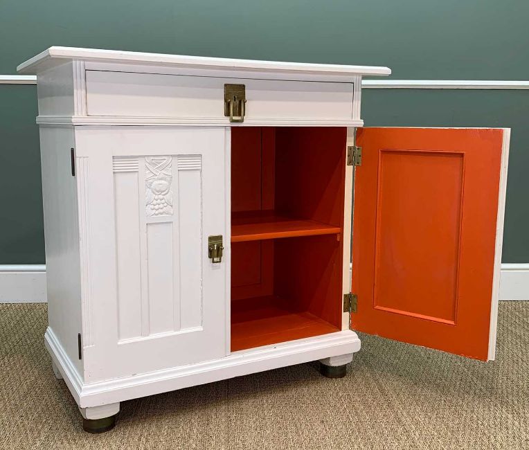 EARLY 20TH C. OAK CUPBOARD, carved panels, later applied brass 'Arts & Crafts' escutcheon and handles, later painted, 99 (h) x 98 (w) x 57cms (d), together with Ducal 'Bellamy' pine kitchen sideboard, 85 (h) x 132 (w) x 45cms (d) (2)Provenance: private collection CardiffComments: cupboard over-painted as stated, pine sideboard sun-bleached top, inspection advised
