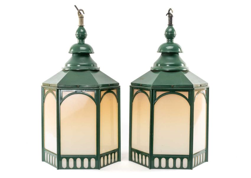 PAIR CARDIFF MARKET PAINTED COPPER LANTERNS, hexagonal section, probably manufactured by D.W.Windsor, Hoddesdon, Herts, 72cms (h), (2)Provenance: private collection Cardiff, acquired during refit, likely first installed in the early 80's, removed 2009Comments: scratches and dings