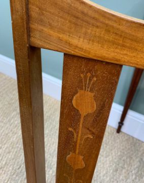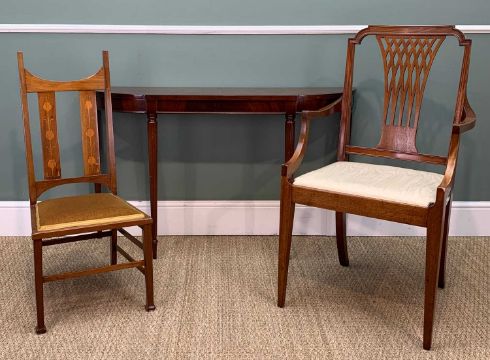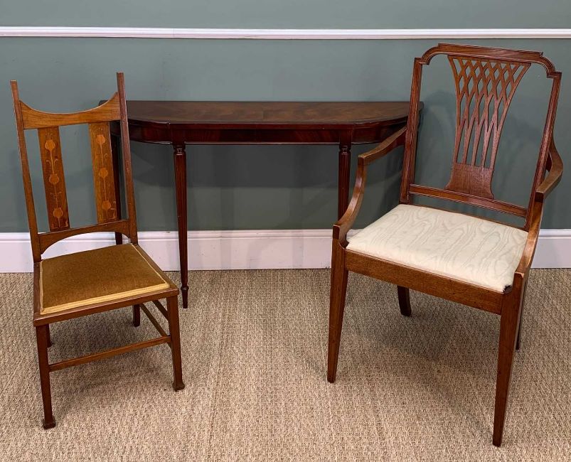 REPRODUCTION GEORGIAN STYLE MAHOGANY CONSOLE TABLE, reeded tapered legs, 72 (h) x 122 (w) x 32cms (d), together with Georgian style mahogany elbow chair plus Arts & Crafts inlaid low hall chair (3)Provenance: private collection CardiffComments: all in good condition, inspection advised