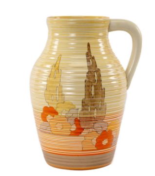 CLARICE CLIFF POTTERY LOTUS JUG, 'Orange Capri' pattern, handle with ribbed body, Bizarre printed mark, 28.5cms (h)Provenance: private collection CeredigionComments: appears good overall, light wear commensurate with age, viewing recommended