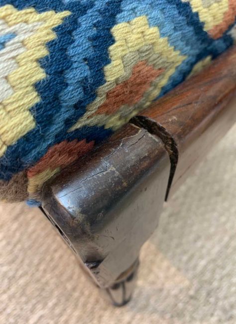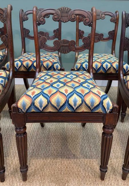 SET OF SEVEN GEORGE IV MAHOGANY DINING CHAIRS, and one associated armchair, Bargello 'punto fiamme' style upholstered seats (8)Provenance: private collection MonmouthComments: general splits, losses and repairs, some squab seats ill-fitting, inspection advised