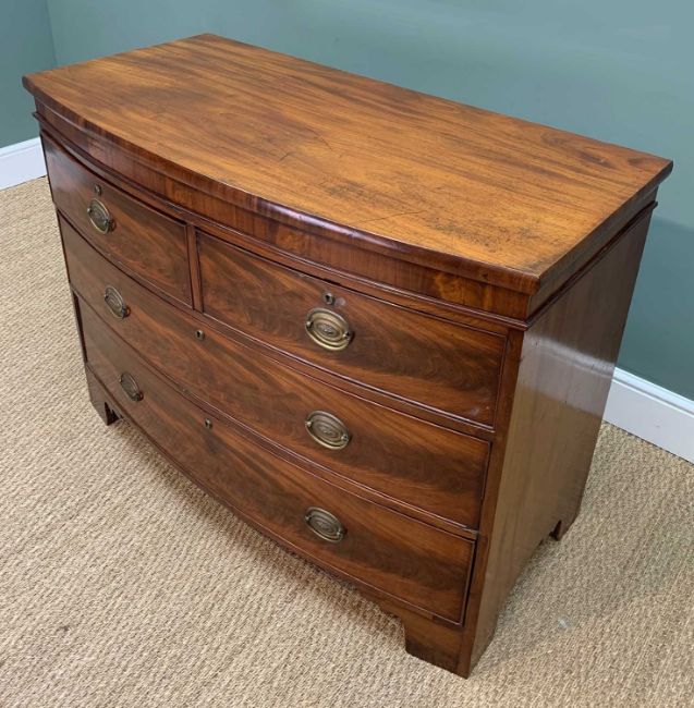 LARGE 19TH C. FLAME MAHOGANY BOW-FRONT CHEST, fitted four drawers, 92 (h) x 122.5 (w) x 61cms (d)Provenance: private collection CardiffComments: likely adapted from a chest-on-chest, moulding/cockbeading splits/losses, split side, general bumps, stains & scratches, adapted feet, inspection advised