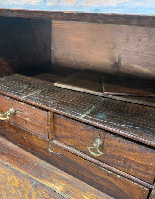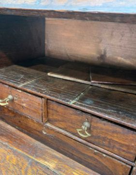 18TH C. OAK BUREAU/CLERKS DESK, fitted interior, 96 (h) x 82 (w) x 49cms (d) together with stained-oak astragal glazed hanging corner cupboard, 108 (h) x 75cms (w) (2)Provenance: private collection CarmarthenshireComments: desk stained/bump/scratches, interior fittings loose and incomplete, drawers & drop-flap support pulls detached but present, inspection advised