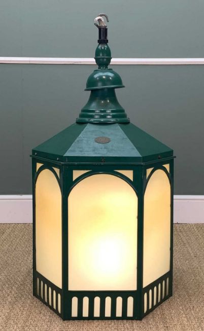 LARGE CARDIFF MARKET PAINTED COPPER LANTERN, hexagonal section, manufactured by D.W.Windsor, Hoddesdon, Herts, numbered, 107cms (h)Provenance: private collection Cardiff, acquired during refit, likely first installed in the early 80's and removed 2009Comments: paint rub/wear