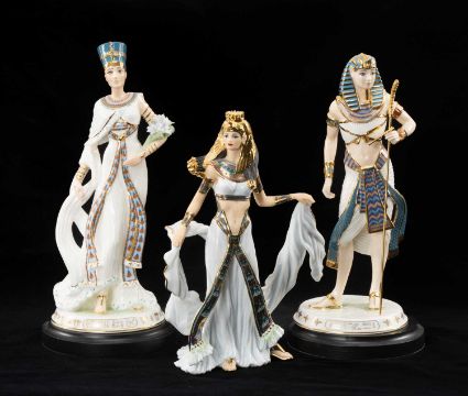 TWO COMPTON & WOODHOUSE WEDGWOOD 'LEGENDS OF THE NILE' FIGURINES comprising, Tutankhamun - The Boy King, limited edition (5678/9500), Nefertiti, limited edition (1820/9500), both with stand and COA, together with Danbury Mint 'Cleopatra', serial number 1322, complete with COA (3)Provenance: private collection CardiffComments: no apparent damage, inspection advised