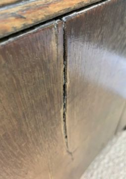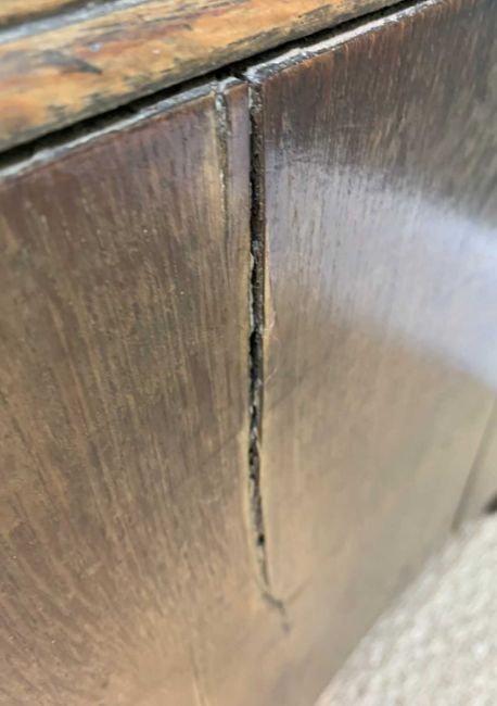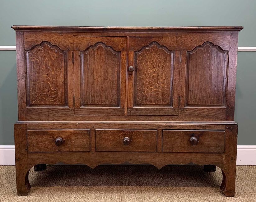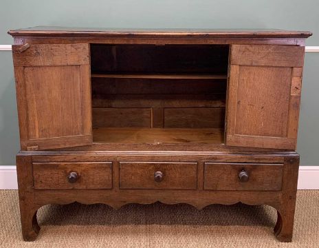 18TH C. WELSH OAK MULE CHEST, probably Carmarthenshire, converted to cupboard, 112 (h) x 144 (w) x 52cms (d)Provenance: private collection CardiffComments: top and sides shrunk, general splits, wear & stains, inspection advised