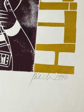 ‡ PAUL PETER PIECH (American, lived / worked Wales 1920-1996) four colour woodcut print - caricature of American diplomat and political scientist Henry Kissinger with the slogan, 'Gwleidydd Rhagrith / Hypocritical Politician', signed and dated 1990, 64 x 45cmsProvenance: private collection NetherlandsComments: unframed