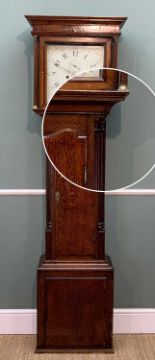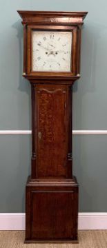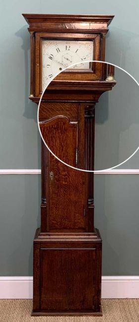EARLY 19TH C. OAK 8-DAY LONGCASE CLOCK, P. Evans of Shrewsbury, square hood, painted dial, calendar aperture, shaped mahogany crossbaded door between fluted angles, 202.5cms hProvenance: private collection CarmarthenshireComments: base restored, lacks feet, timbers loose/shrunk, handle with care.