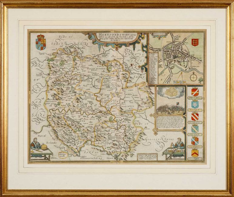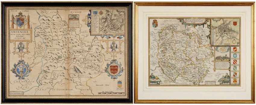 JOHN SPEED coloured & tinted antiquarian maps - two maps, Breknoke with insert of Breknoke Castle, 40 x 52cms and Herefordshire with an insert of Hereford town centre, 39 x 51cmsProvenance: private collection CarmarthenshireComments: framed, glazed