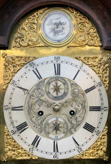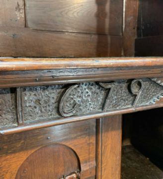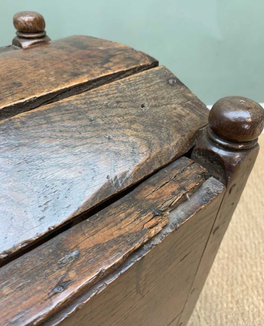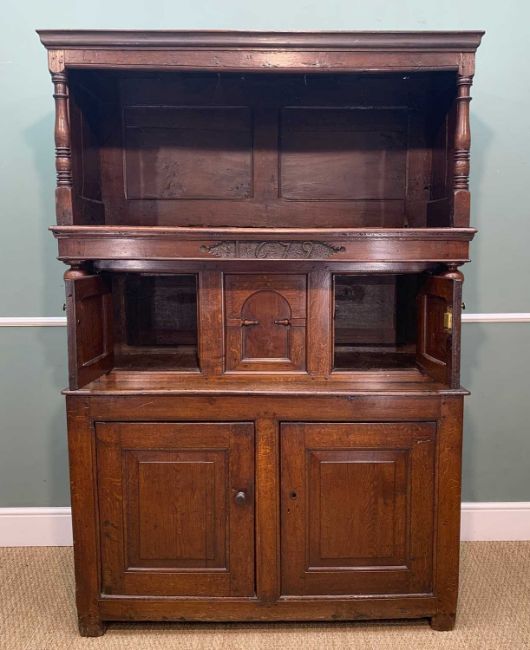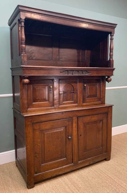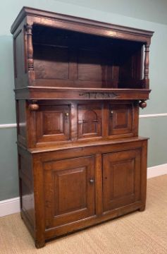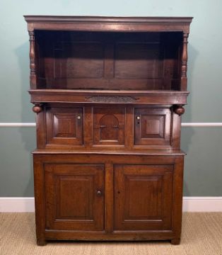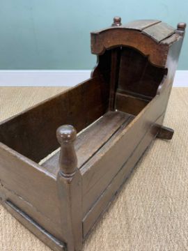ANTIQUE WELSH OAK FURNITURE, comprising 18TH C. WELSH OAK TRIDARN, panelled canopy, baluster columns, engraved panel '1679', cupboard base, stile feet 192 (h) x 130 (w) x 54cms (d), rear of canopy with old insect damage to lower cross piece, workman's initials stamped to right side of canopy 'WT', cupboard handles replaced, some later elements, otherwise good colour, EARLY 19TH C. OAK & MAHOGANY CROSS BANDED LONGCASE CLOCK, eight day movement, boxwood inlaid swan neck pediment and columns, 10.5" brass dial with silvered Roman chapter ring, foliate carved centre, subsidiary seconds and calendar dials, pierced brass spandrels, shaped door, panelled base, hood damaged with losses, dial worn, with pendulum and weights, ANTIQUE PANELLED OAK CRIB, with hood, turned finials on bowed rockers, 68 (h) x 92 (w) x 54cms (d), base boards warped, two panels with large splits, old repairs and damage to panels, colour good (3)Provenance: deceased estate CardiffComments: as stated in description, no further condition report available, inspection advised