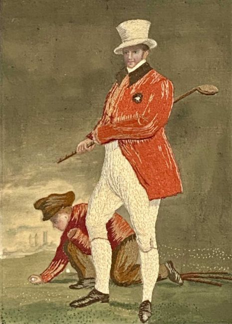 THREE REGENCY SILK EMBROIDERED PICTURES, mother and child, 25.5 x 19cms, golfer with caddy, 19.5 x 14cms, and oval lady with spinning wheel, 19.5 x 15cmsProvenance: deceased estate Conwy