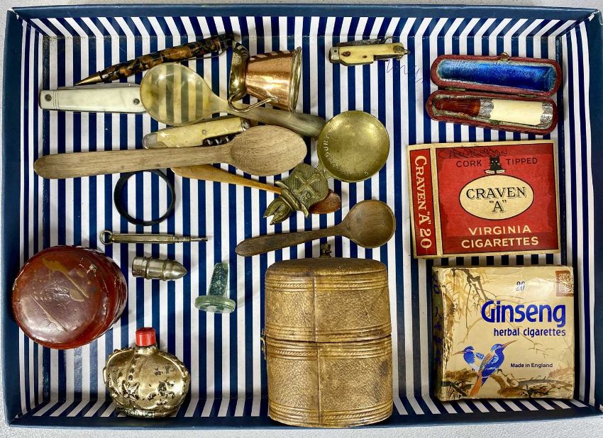 ASSORTED ANTIQUE & VINTAGE COLLECTABLES, including silver-mounted cheroot holder in red Moroccan leather case, chrome Colibri cigarette box with incorporated lighter, British Occupation Zone cigarette case, two pairs of spectacles, various penknives, and other collectablesProvenance: private collection ConwyPLEASE NOTE: ID and proof of age must be provided upon collection of this Lot