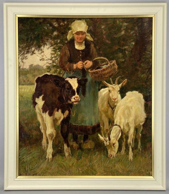 JULIUS PAUL JUNGHANNS (1876-1958) oil on board - lady in bonnet feeding goats and calf, signed, 66 x 56cmsProvenance: private collection Ynys MônComments: framed