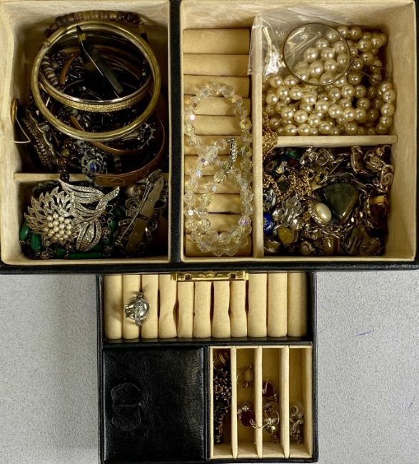 ASSORTED COSTUME JEWELLERY, including bangles, brooches, and rings, contained in a black jewellery box with lift out compartmentProvenance: private collection Cheshire