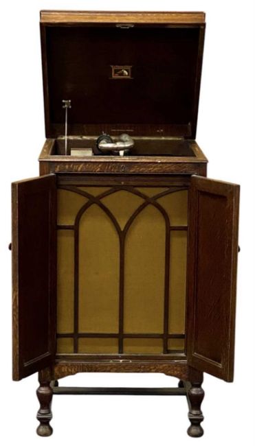 EDWARDIAN OAK HMV SPEAKER CABINET with winder, 102 (h) x 54 (w) x 53cms (d)Provenance: private collection Denbighshire