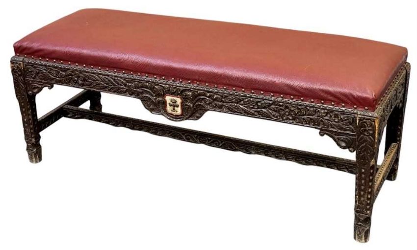 ANTIQUE OAK LONG STOOL, heavily carved frame painted to the centre with oak tree crest, later vinyl upholstered cushioned seat, 55 (h) x 135 (w) x 49cms (d)Provenance: Conwy County Council, Bodlondeb Civil Offices, Conwy