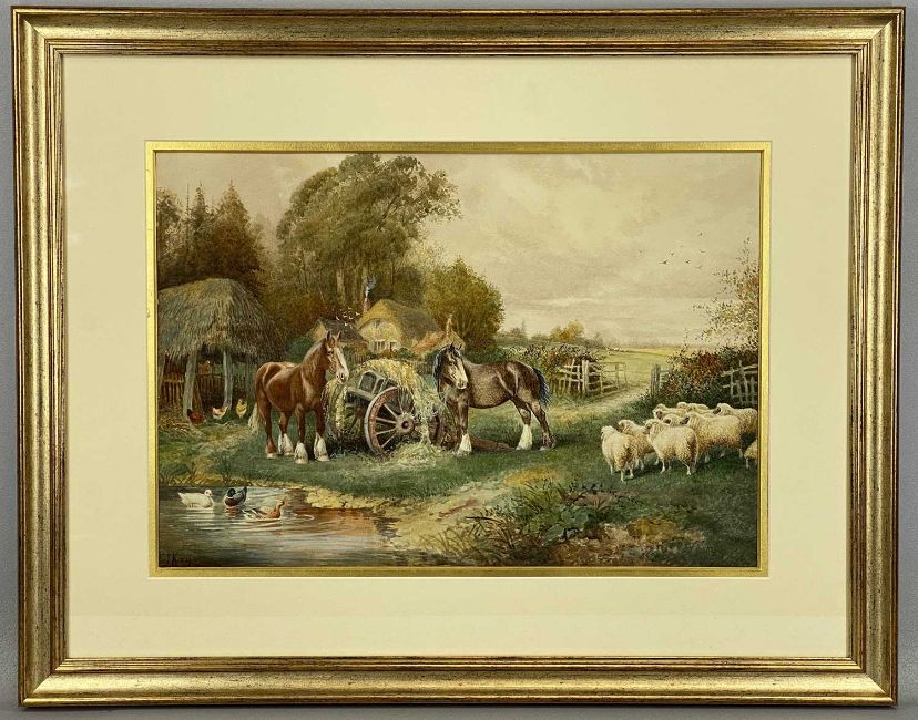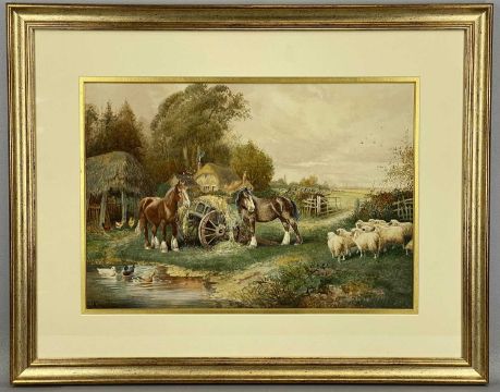 C. J. KEATS watercolour - farmyard with thatched cottage, shire horses, sheep, and ducks, signed, 34 x 49cmsProvenance: private collection Ynys MônComments: framed and glazed