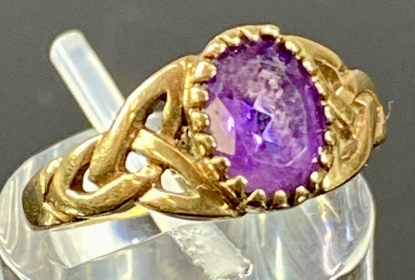 9CT GOLD AMETHYST SINGLE-STONE RING with openwork shoulders, size J, 2.5gProvenance: private collection Conwy
