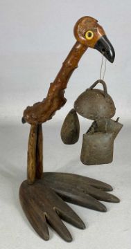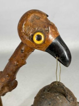 POSSIBLY HENRY HOWELL & CO. FOR ALFRED DUNHILL root wood and bakelite bird, with chimes hanging from the beak, standing on outsize wooden feet, 43cms (h)Provenance: private collection Conwy