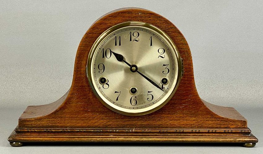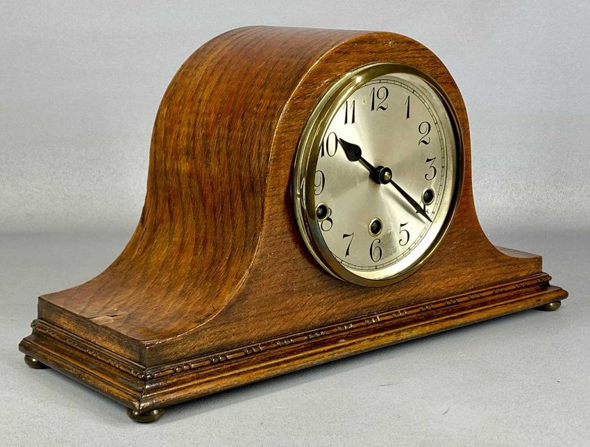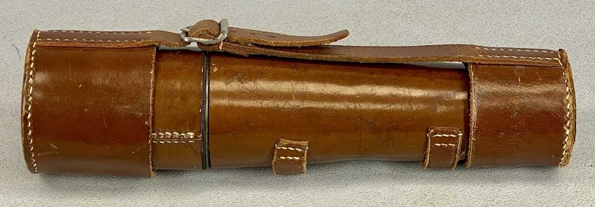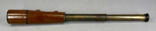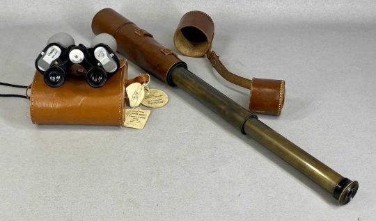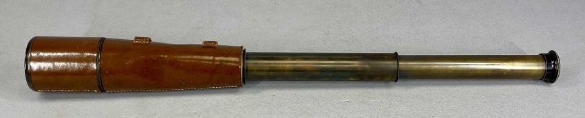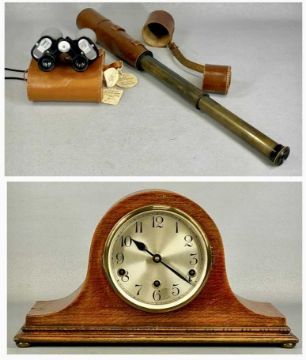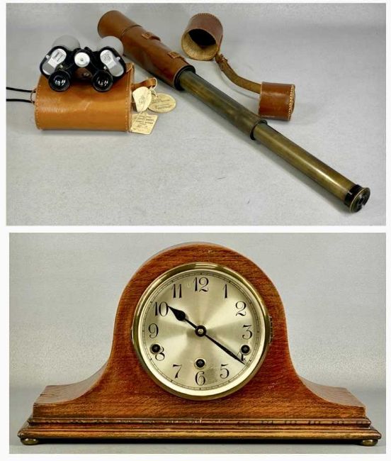 DOLLOND LONDON WWI PERIOD SIGNALLING TELESCOPE, three draw, no. 7656, lacquered brass with leather covered end and leather lens caps, with pair of Greenkat 10x40 binoculars in leather case and mahogany dome top mantel clockProvenance: private collection Conwy