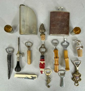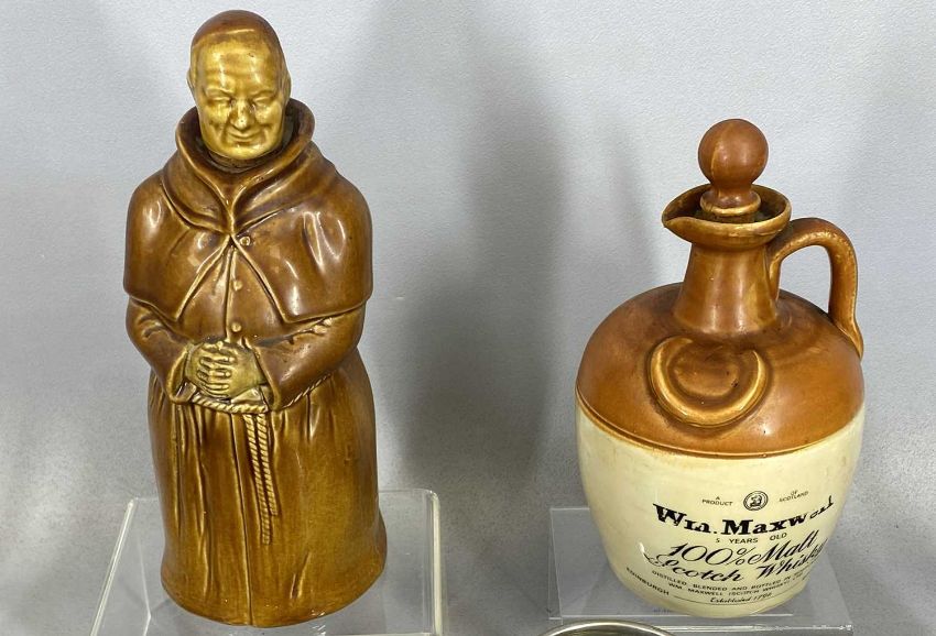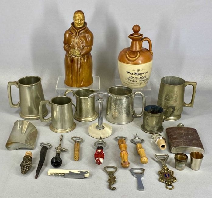 VARIOUS DRINKS CABINET CONTENTS including John McEwan ceramic abbot decanter, Wm. Maxwell scotch whisky decanter, leather covered hip flask, various bottle openers, bar tools, pewter tankards, etc.Provenance: deceased estate Conwy