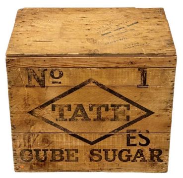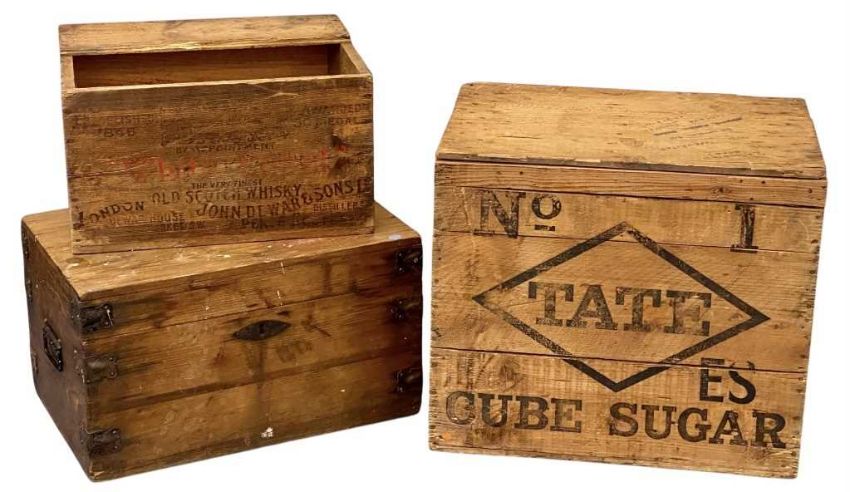 THREE VINTAGE BOXES, 'Tate Cube Sugar', 45 x 52 x 37cms, banded trunk, 29 x 51 x 33cms and 'John Dewar & Sons Scotch Whisky', 25 x 43 x 32cmsProvenance: private collection Ynys Môn