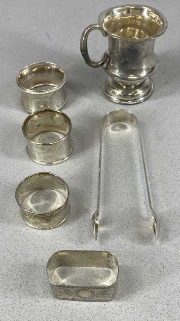 ASSORTED SILVER COLLECTABLES, including Christening mug, baluster salt, two pairs of sugar tongs, and various napkin rings, approx. 9.5ozt grossProvenance: private collection Conwy