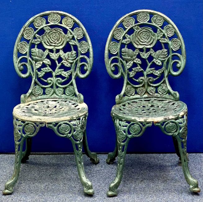SET OF FOUR HEAVY CAST IRON GARDEN CHAIRS,RECTANGULAR OCCASIONAL TABLE,48 (h) x 92 (w) x 50cms (d) painted greenProvenance: private collection Gwynedd