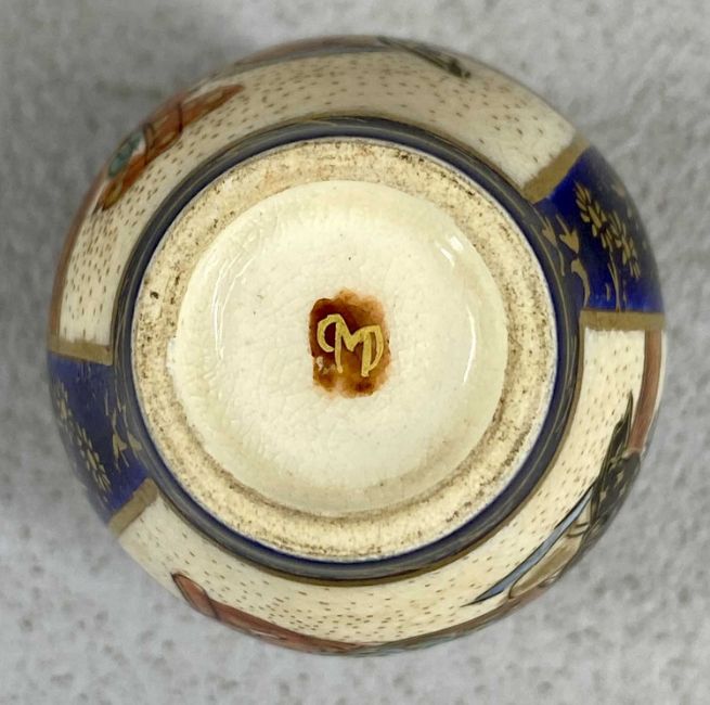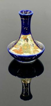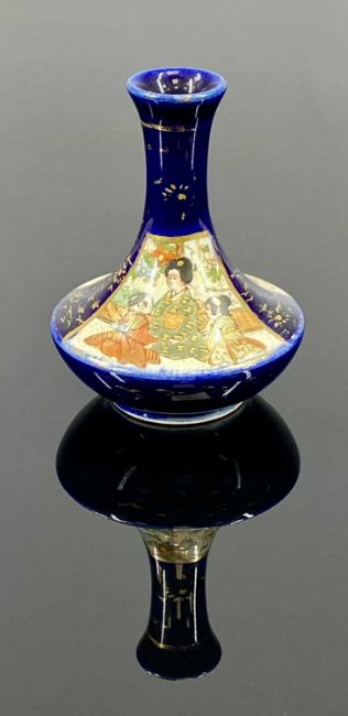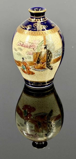 TWO MINIATURE SATSUMA VASES, late 19th century, blue and cream baluster form, panels decorated with figures, 6cms (h); and blue and cream with flared body and narrow neck, panels decorated with figures, 6cms (h)Provenance: private collection Denbighshire