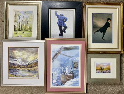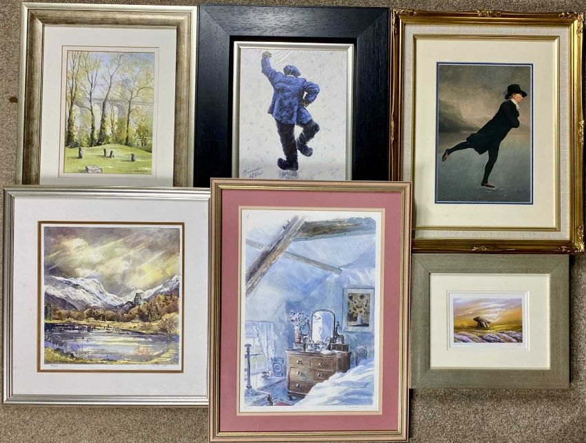 WELSH & OTHER ARTISTS GROUP OF PICTURES, including KEITH ANDREW (b. 1947) limited edition (493/875) colour print - 'First Light', signed, titled, and numbered in pencil, 40 x 27.5cms; G. ROBERTS watercolour - 'Pont Menai', signed lower right, 25 x 17.5cms; PHILIP GRAY colour print - 'Poulnabrone Dolmen', titled and signed in pencil, 11 x 15cms; CHRISTINE SCOTT limited edition (60/250) colour print - 'Late Snows - Dolbadarn Castle, Llanberis', signed and numbered in pencil, 29 x 28cms; etc. (6)Provenance: private collection ConwyComments: framed and glazed