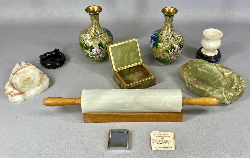 ASSORTED COLLECTABLES including Chinese cloisonne vases decorated with flowers and birds, 21cms (h) including pierced hardwood stands, marble rolling pin with wooden handles and stand, 46cms (l), green onyx ashtray and cigarette box, Magna electric cigarette lighter, etc.Provenance: deceased collection Conwy