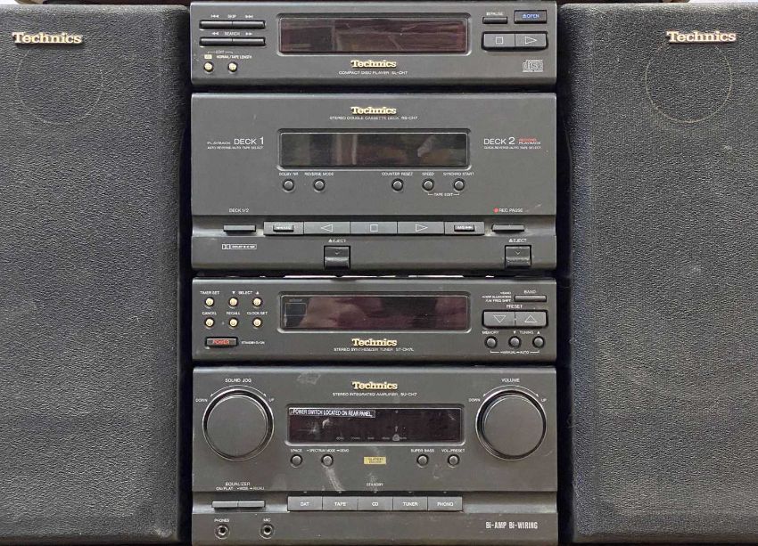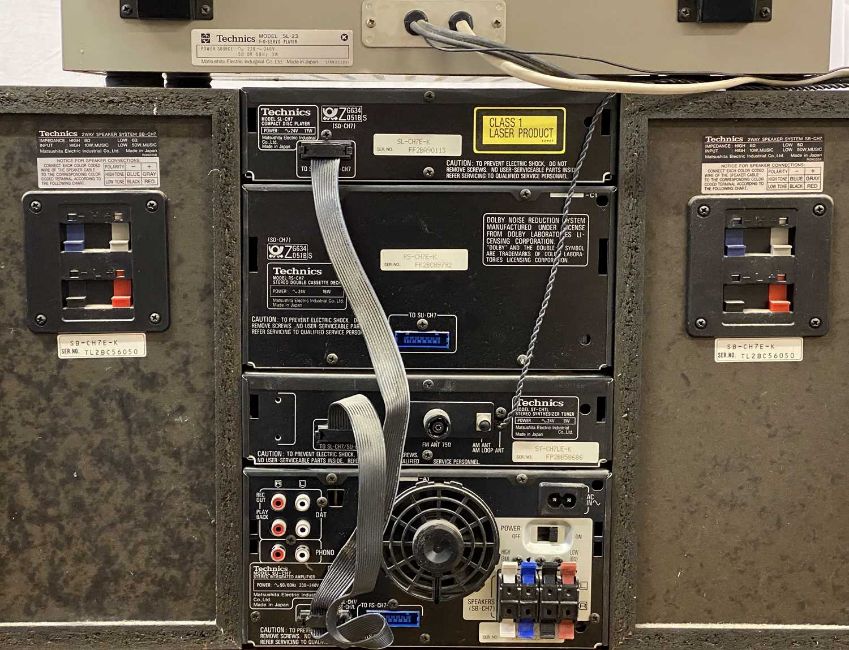 TECHNICS TURNTABLE SL-23, a compact stacking Technics music system, and a pair of speakersProvenance: private collection Denbighshire