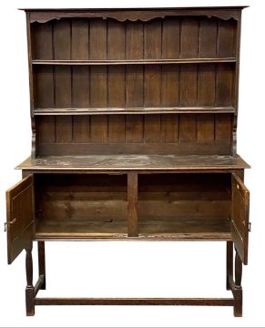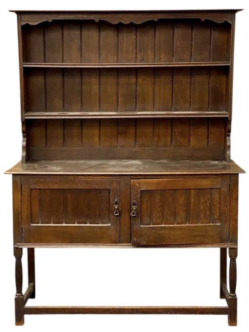 SMALL OAK DRESSER, circa 1900, two shelf rack, open bottom base with two cupboard doors, 182 (h) x 128 (w) x 52cms (d)Provenance: private collection Denbighshire