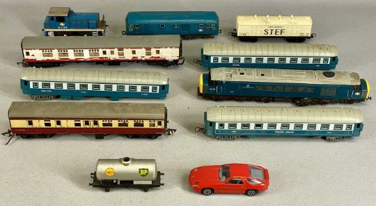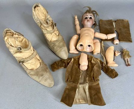 ASSORTED TOY COLLECTABLES, including Simon & Halbig bisque headed doll, antique ladies' silk shoes, miniature bisque porcelain doll, and a part electric train set, etc.Provenance: private collection Conwy
