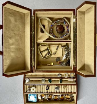 CASE OF COSTUME JEWELLERY, including bangle, rings, cufflinks, etc., contained in a tan jewellery case with lift out compartmentProvenance: private collection Cheshire