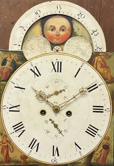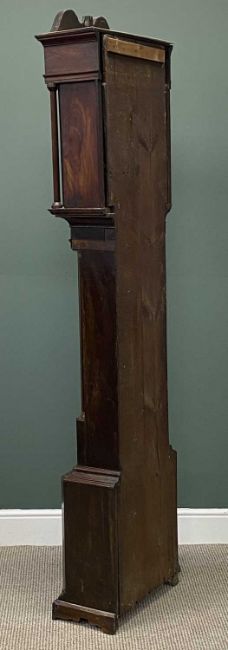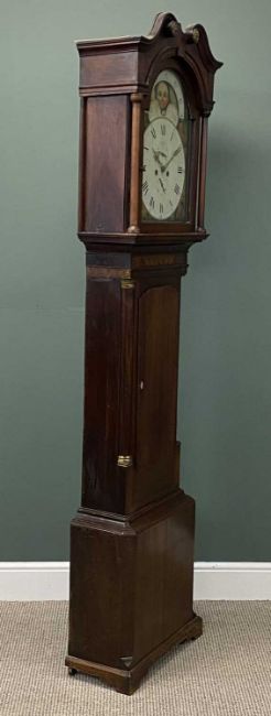 19TH CENTURY MAHOGANY LONGCASE CLOCK, arched painted enamel dial with rolling moon movement, subsidiary seconds and date dials, 223 (h) x 55 (w) x 27cms (d)Provenance: private collection Conwy