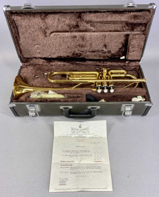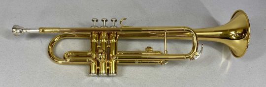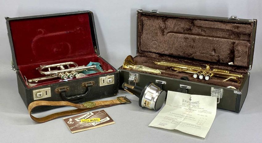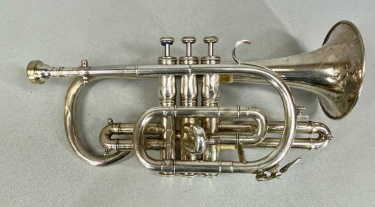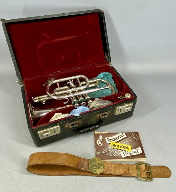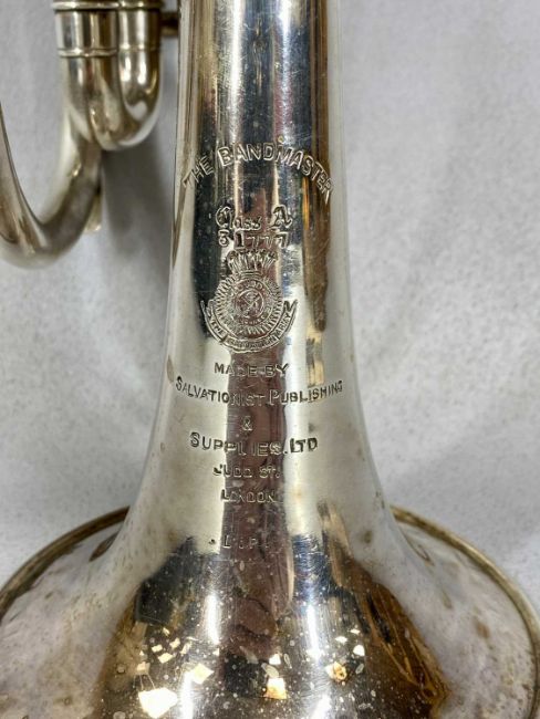 'THE BANDMASTER' CORNET, frosted silver finish, and a Yamaha trumpet, polished brass finish, both in fitted cases (2). N.B. AMENDED DESCRIPTION - THE CORNET IS A BANDMASTER & NOT IMPERIAL, please see imageProvenance: private collection Conwy