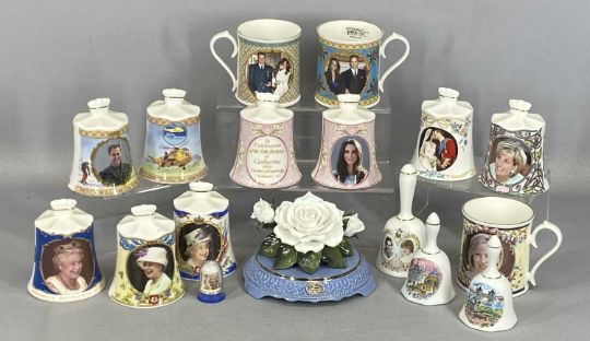 COALPORT DIANA PRINCESS OF WALES FIGURINE, in wedding gown, sculpted by J. Bromley, 23cms (h); together with Coalport Diana 'The Jewel in the Crown' figurine, b J. Bromley, 24cms (h); Coalport 'Sophie, Her Royal Highness the Countess of Wessex', sculpted by J. Bromley, 23cms (h); Diana snow globe; Diana Princess of Wales rose ornament; commemorative china bell, and other commemorative itemsProvenance: deceased estate Conwy