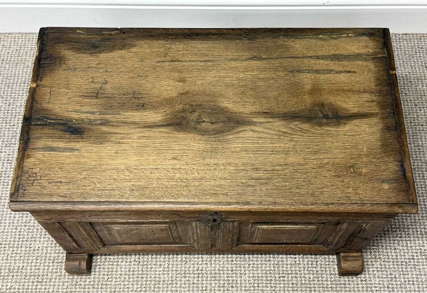 EARLY OAK SMALL COFFER, 43 (h) x 77 (w) x 43cms (d)Provenance: private collection Conwy