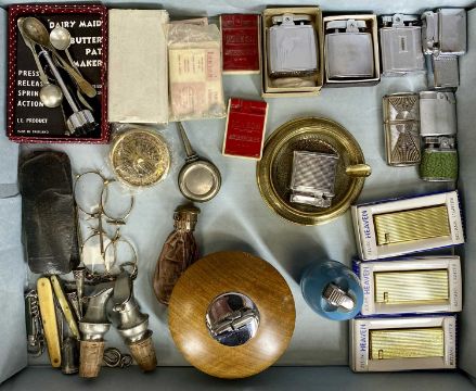 ASSORTED COLLECTABLES, including Chinese lacquered playing card box with coin inlay, various cigarette lighters, bottle stoppers, Crawford's biscuit tin, etc.Provenance: private collection Conwy