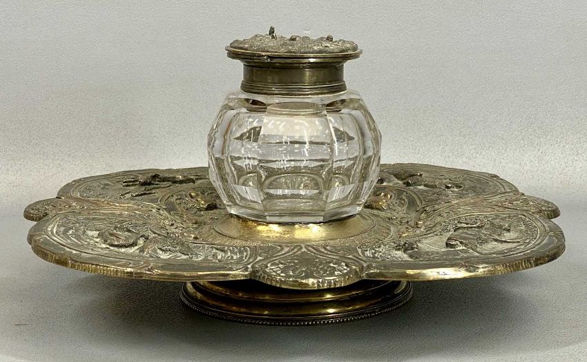 INTERESTING DESK STAND, having wildlife scene relief and accompanying inkwell, 32 x 32cms